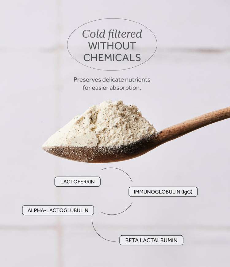 We use 100% pure organic coffee powder that’s freshly brewed then dried to a powder with zero additives - no coffee extracts and no artificial flavourings. Our signature cold-filtered whey is 80% undenatured, preserving valuable bioactive proteins like immunoglobulins and lactoferrin. These can be lost in high-heat or harsh processing, which is why our gentle cold filtering method matters.